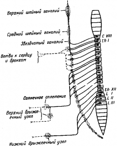 Симпатическая нервная система берет начало от последнего шейного и до III поясничного сегмента спинного мозга. Значительная часть этих волокон, выйдя из спинного мозга, входит в узлы, находящиеся у позвоночника. Эти узлы, или ганглии, образуют пограничную симпатическую цепочку. Значительная часть этих, волокон прерывается здесь, остальные же прерываются в ганглиях, находящихся дальше от позвоночно го столба. К таким узлам относятся верхний и средний шейные узлы, звездчатый, или нижний шейный узел, узлы солнечного сплетения, верхний и нижний брыжеечные узлы и др.