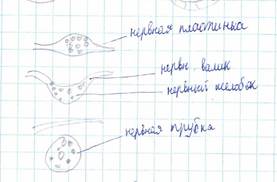 В клетках мезодермы вырабатывается фактор роста нейронов, а действует он на клетки эктодермы, и эти клетки превращаются в нервную пластинку. У зародыша в 2,5 недели (1,5 мм) появляются нервный желобок и нервные валики. На 3-4-ой неделе (5 мм зародыш) появляется нервная трубка, она обособляется от эктодермы и погружается внутрь зародыша. Из нервной пластинки образуется нервная трубка (клетки эктодермы -> нервная