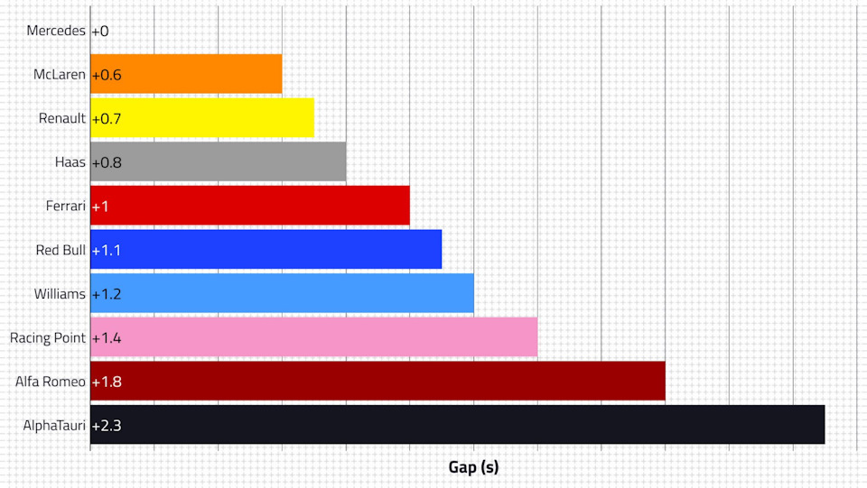 Mercedes показали также и самый высокий средний темп на длинных заездах — на секунду быстрее, чем Ferrari, и на 1,1 секунды быстрее, чем Red Bull. На коротких дистанциях они опережали Red Bull уже на 1,6 секунды и на 1,7 секунды были быстрее Ferrari.