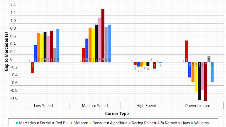 Зато Mercedes имел явное и значительное преимущество в среднескоростных поворотах (1-2, 4, 7-8, 12-13), где успевал не только отыгрывать свое отставание от Скудерии, но и получать преимущество.