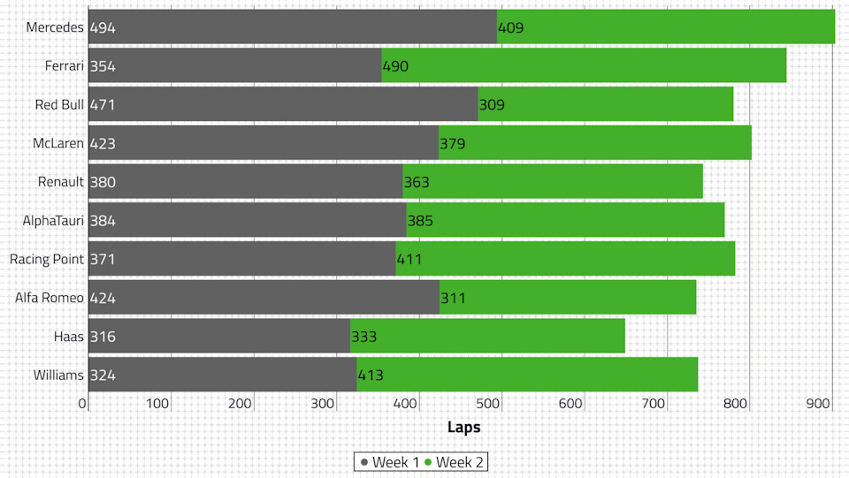 Если проанализировать все шесть дней предсезонных тестов, то Mercedes закончили их с наилучшим результатом. Было пройдено 903 круга, которые составили дистанцию примерно 13 Гран-при Испании. Это на 59 кругов больше, чем у Ferrari, которые во вторую неделю показали лучший результат среди всех команд — 490 кругов.