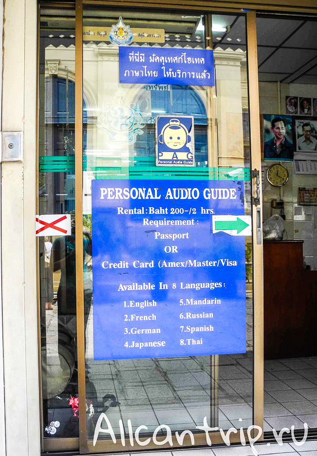 Там же, рядом с кассами, можно арендовать аудиогид (200 бат за 2 часа), доступно 8 языков, в том числе, русский: