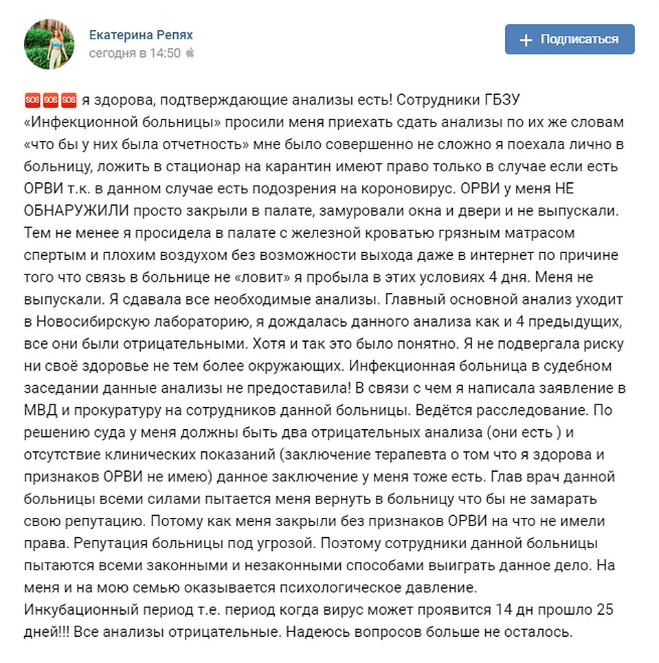 - Инфекционная больница в судебном заседании мои чистые анализы не предоставила! В связи с чем я написала заявление в МВД и прокуратуру на сотрудников данной больницы. Ведется расследование. По решению суда у меня должны быть два отрицательных анализа (они есть) и отсутствие клинических показаний (заключение терапевта о том, что я здорова и признаков ОРВИ не имею) - данное заключение у меня тоже есть. Главный врач данной больницы всеми силами пытается меня вернуть обратно, чтобы не замарать свою репутацию. На меня и на мою семью оказывается психологическое давление. Инкубационный период коронавируса, как я слышала, составляет до 14 дней. В моем случае прошло уже 25 суток, а все анализы отрицательные, - подвела общий знаменатель своей речи девушка.