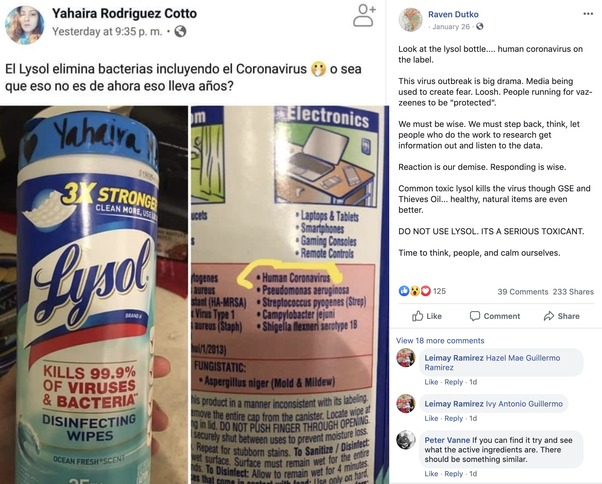 Lysol — a popular disinfectant branded as effective against bacteria and viruses — was mentioned a lot by people in general as they shared concerns about the new coronavirus strain (2019-nCoV.) But in the first post above from Facebook, a commenter said: