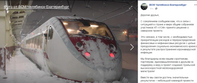 Проект строительства высокоскоростной железнодорожной магистрали (ВСМ) между Екатеринбургом и Челябинском был заморожен.