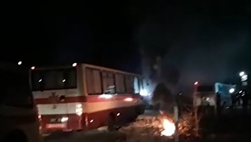 Протестующие бросали камни в автобус и в полицейских и жгли шины на дороге, чтобы помешать автобусам проехать к медицинскому центру.