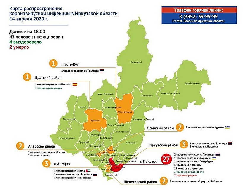 Общее количество районов Иркутской области, где есть инфицированные, достигло 12. Первого заболевшего выявили в Зиминском районе. Известно, что человек приехал из Москвы. Новый зараженный есть и в Братском районе. Ранее там был только один случай — 39-летний мужчина был первым выздоровевшим в регионе. Свежий случай — инфекцию также привезли из Москвы.