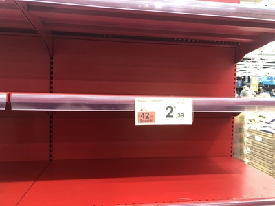 на 25 февраля, юг италии еще все спокойно, только некоторые паникующие (или как они называют себя - предвидящие будущее) уже заранее закупились. На самом деле запас пасты чуть немного больше чем в обычное время 😂
