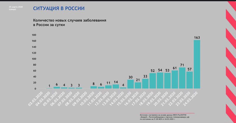 В России на 25 марта насчитывается 658 зараженных коронавирусом SARS-CoV-2, за сутки прибавилось 163 случая инфицирования – это на сегодняшний день рекордная прибавка для России, прирост составил почти 33%.