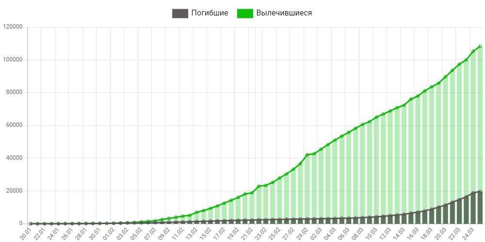 Всего от последствий заражения скончались 19700 заболевших, более 2300 новых жертв за сутки. Число погибших в предыдущие сутки было менее 1900. Поправились к 25 марта свыше 108 тысяч человек.
