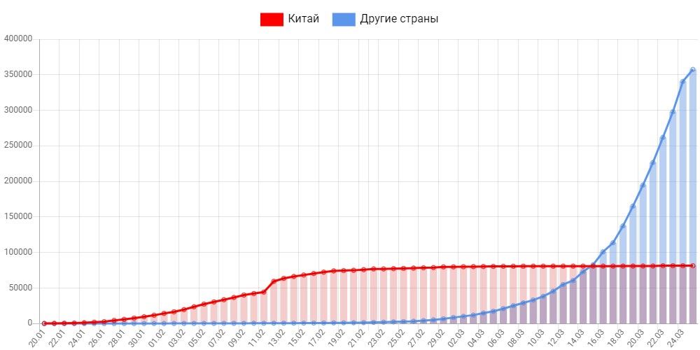 К среде, 25 марта 2020 года, число заболевших и умерших от нового китайского коронавируса COVID-19 (2019-nCoV) по всему миру: