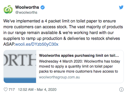 Крупнейшая в стране торговая розничная сеть Woolworth продает одному покупателю не более четырех упаковок туалетной бумаги. В компании отметили, что это правило распространяется как на офлайн-, так и на онлайн-покупки.