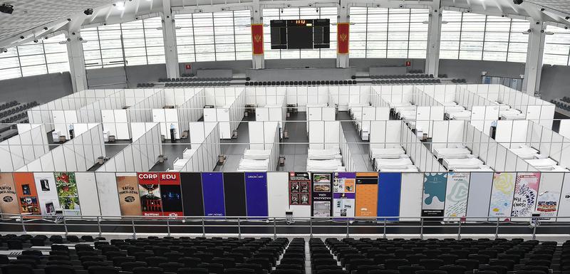 Интересно, что власти Черногории идут на опережение событий, построив временные больницы в 4 городах на месте спорткомплексов. Дай Бог, чтобы они остались пустовать, не понадобились. На фото — „Bemax arena“ в столице.