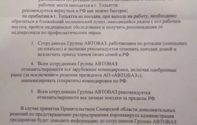 В документе сообщается, что все сотрудники Группы АВТОВАЗ, прибывшие для работы в Москву и возвращающиеся из стран повышенного риска из командировки или личной поездки, обязаны выдержать карантин в течение 14 дней. К странам повышенного риска на данный момент относятся Иран, Южная Корея, Италия, Китай, Франция, Германия, Испания, Великобритания, США, Швейцария и Норвегия.