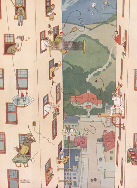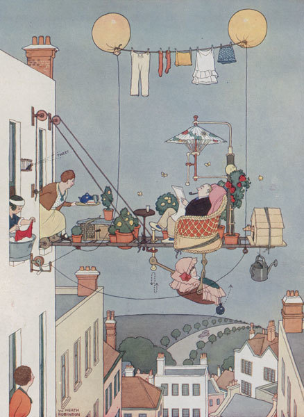 Рисунки английского иллюстратора, мультипликатора, изобретателя и сатирика Уильяма Хита Робинсона, датированные началом XX века, не теряют актуальности и остаются неисчерпаемым источником вдохновения для архитекторов, дизайнеров и художников. В реалиях карантина и самоизоляции его изобретательные рисунки "Складной сад" и "Идеальный дом" выглядят очень жизненными. Все, кто мечтает сейчас об активности и свежем воздухе, наверняка с улыбкой и завистью смотрят на героев Робинсона.