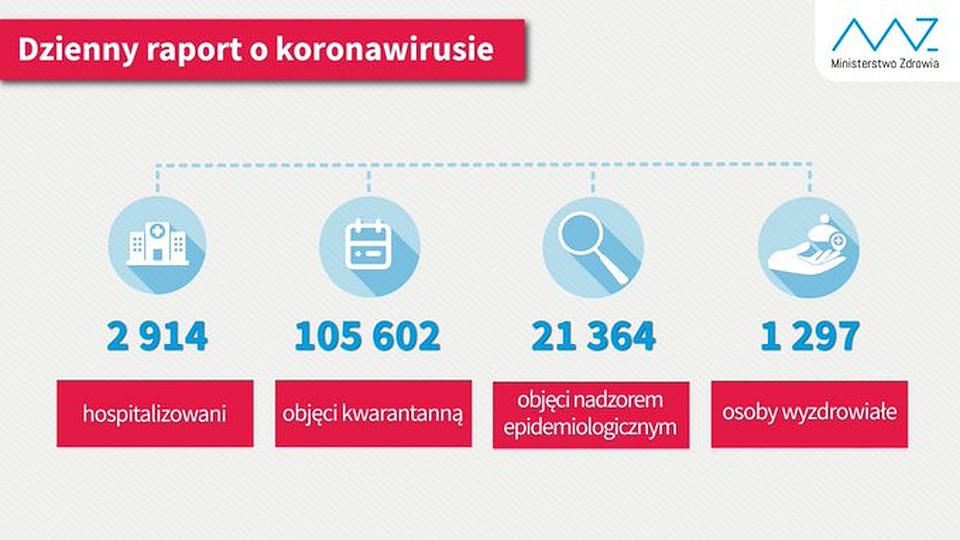 По последним данным министерства здравоохранения Польши , а они озвучены утром 21 апреля, в стране с момента начала эпидемии в Польше зарегистрировано 9737 случаев заражения новым коронавирусом. За это время умерли 385 человек. В больницах с коронавирусом находятся 2914 человек. Выздоровели 1297 пациента. Отчет с актуальными цифрами и количеством заболевших в отдельных воеводствах польский Минздрав публикует ежедневно.