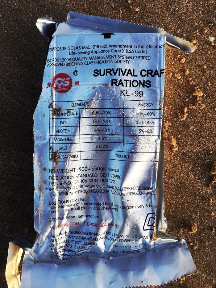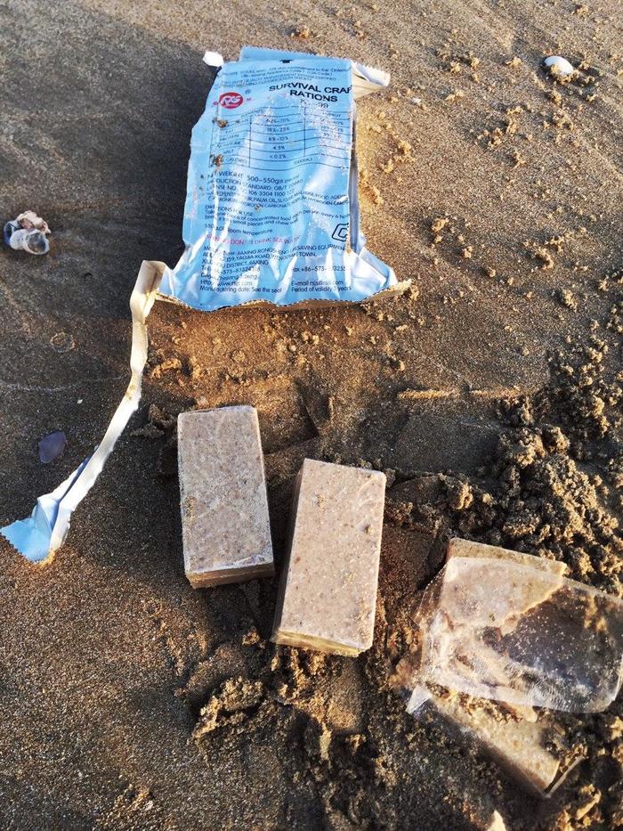 А это, кстати, привет от китайцев. Такие сухпайки лежат на берегу моря, видимо сброшены с корабля. Открыл, понюхал, неплохо пахнет, но пробовать всё же не стал.
