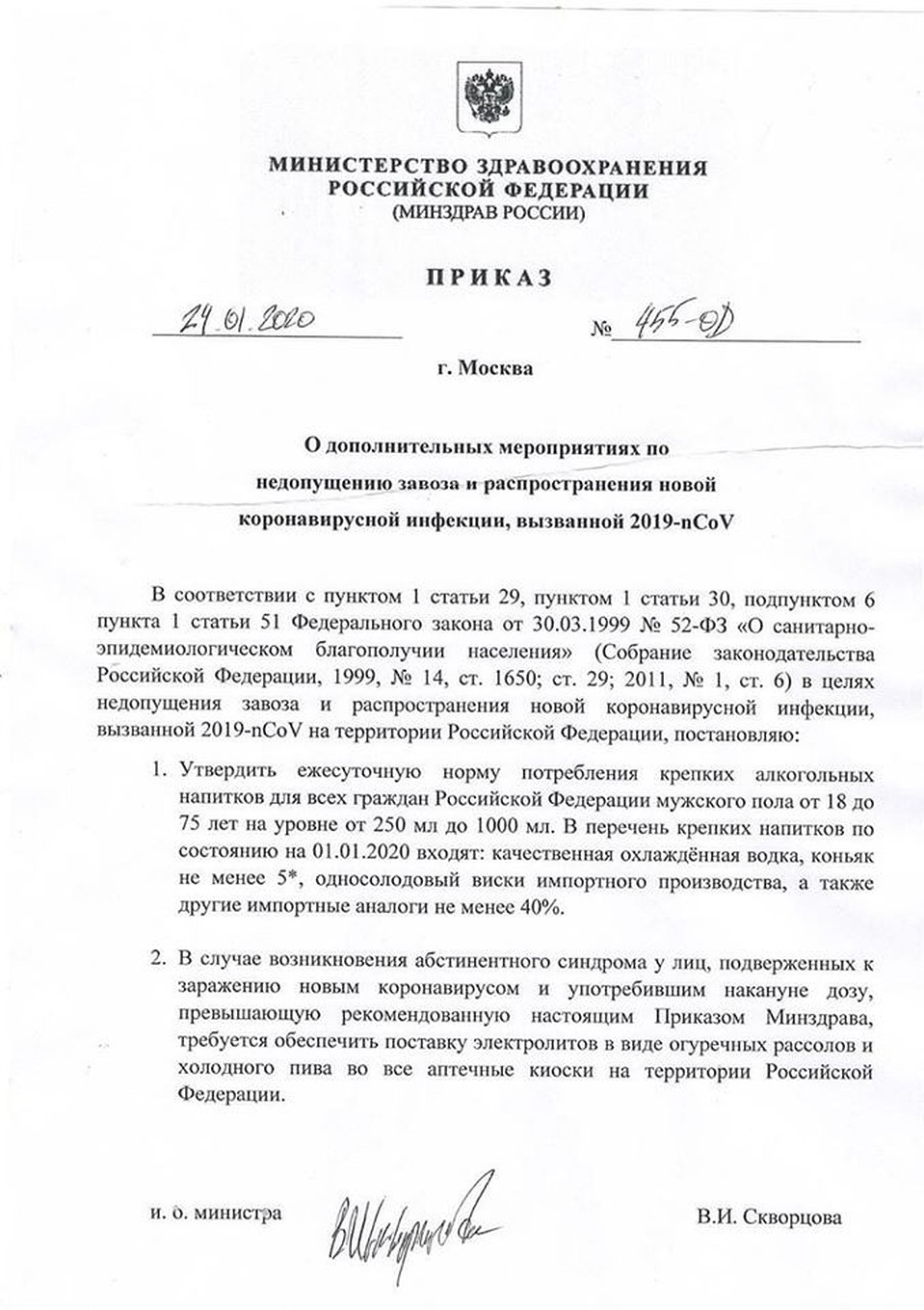 Кто-то забросил в сеть Приказ Минздрава России от 24 января 2020 года с названием "О дополнительных мероприятиях по недопущению завоза и распространения новой коронавирусной инфекции, вызванной 2019 -nСoV". В нем говорится "об утверждении нормы потребления крепких алкогольных напитков для всех граждан России от 18 до 75 лет на уровне от 250 мл. до 1000 мл".