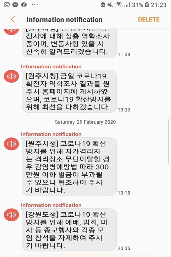 Кеча, 28 февраль куни биз яшайдиган Вонжу шаҳрида ҳам коронавирусга чалиниш билан боғлиқ илк ҳолат аниқланди. Бундан ОАВ ёки ТВ орқали хабар топди, деб ўйлашингиз мумкин. Йўқ, бу ҳақда шаҳар ҳокимияти мобил СМС орқали тезкорлик билан хабар берди. Шунингдек, касалликка чалинган кишининг манзили, оила аъзолари, вирус аниқланишига қадар қаерда бўлгани тўғрисида барча батафсил маълумотлар ҳам юборилди.