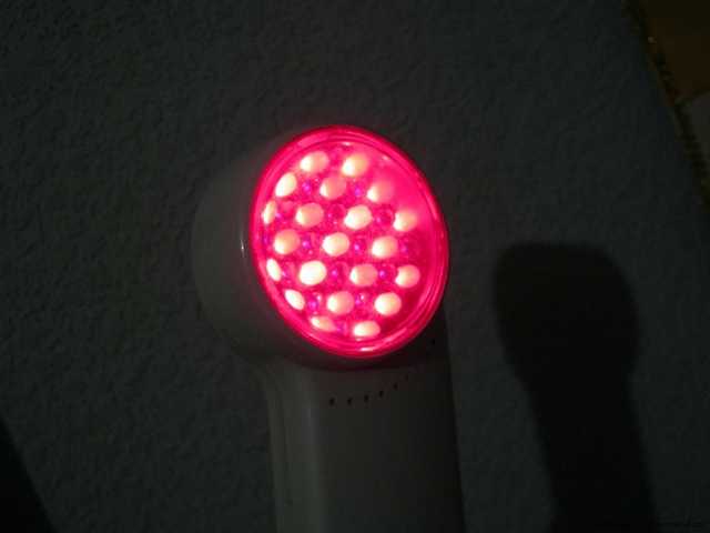Прибор небольшой и очень легкий, не шумит, имеет шнур, который растягивается(смотри фото) При включении в розетку светится красным светом и инфракрасным, второго не видно, но он вроде есть. Свет исходит из маленьких лампочек, спрятанных под красным стеклом-аппликатором(защитным фильтром). Половина лампочек светится, а другая-нет. Вероятно именно вторые излучают инфракрасные лучи. Забавно, интересно. На фото видно что свет проходит скозь пальцы. Я так понимаю, что также он проникает глубоко внутрь тела вне зависимости от области применения. Цвет в жизни у света ярко-алый, а не оранжевый, как вышло на фото. Фотографировала без вспышки.