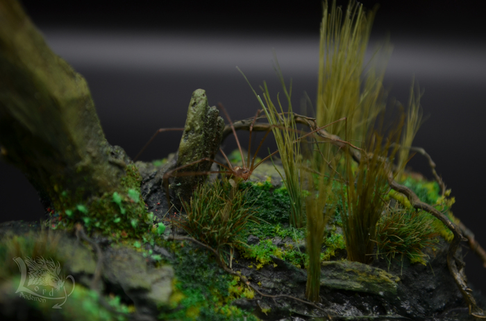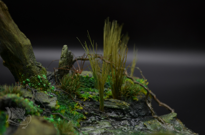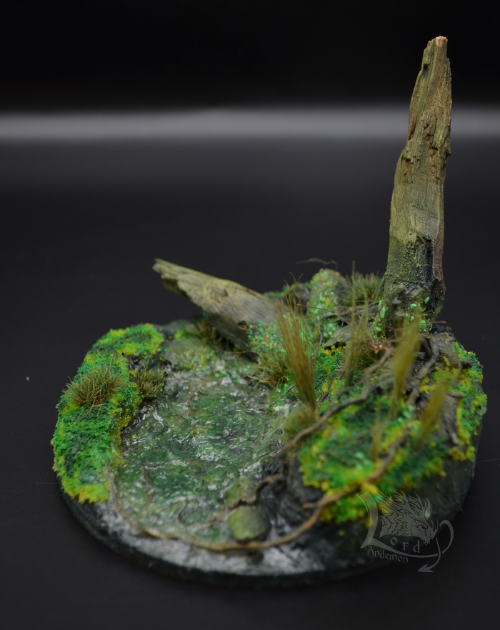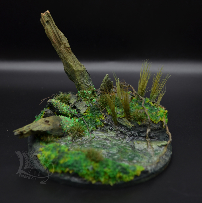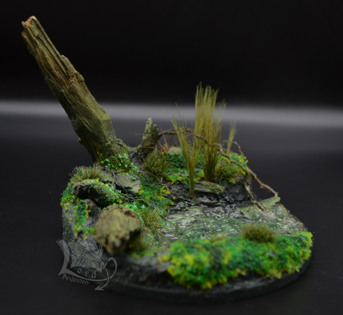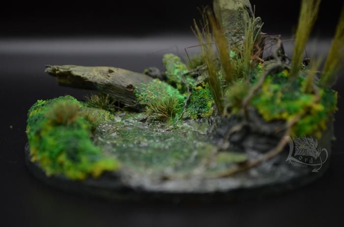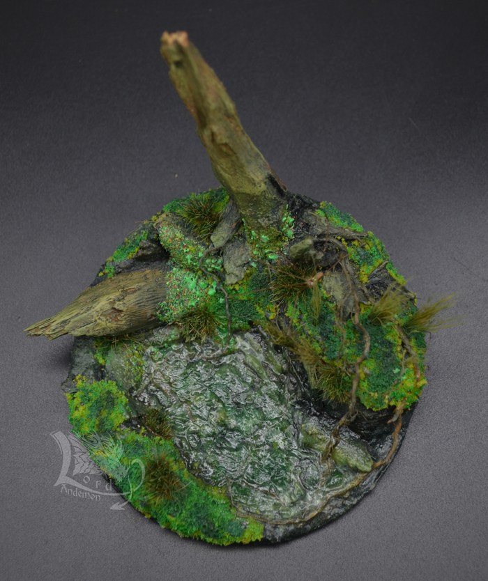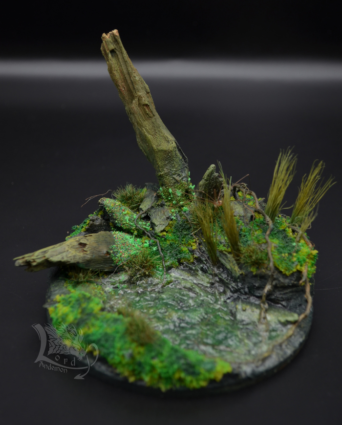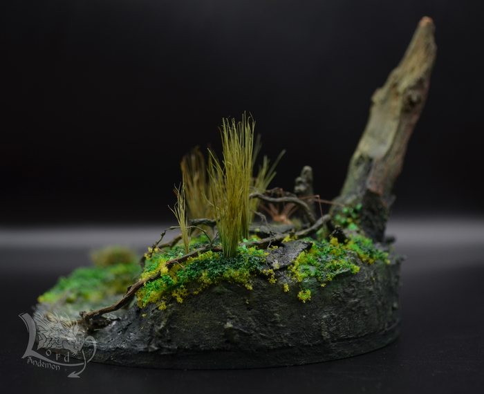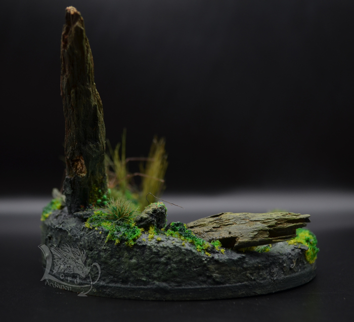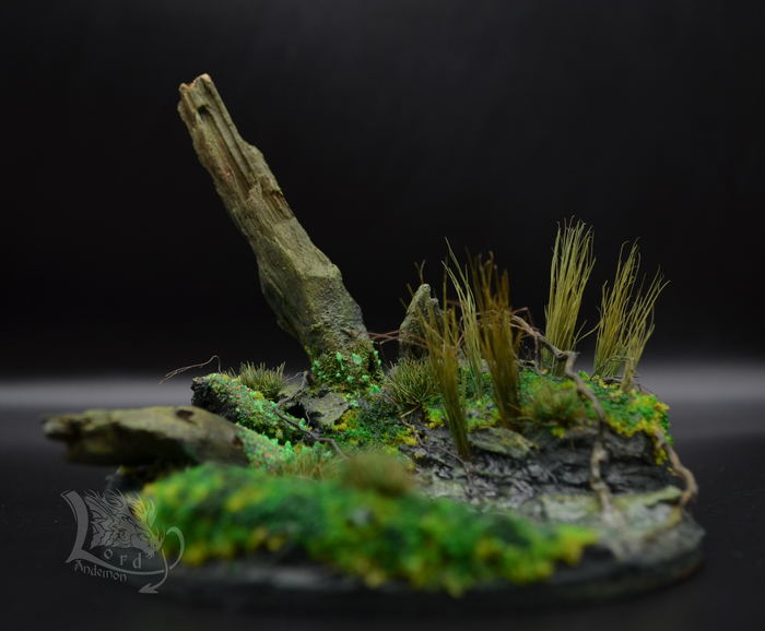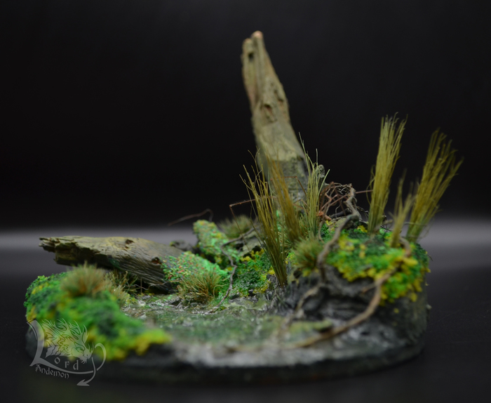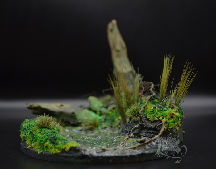 Это была именно первая попытка сделать диораму. Хотелось попробовать сделать имитацию болота, вроде как удалось.) Данная тематика мне интересна, как отдельный вид творчества, так и под собственные скульптуры. Может однажды сподоблюсь на что-то более масштабное. Пока же в процессе есть пара небольших деревьев по одной игре. Но их я выложу позже.