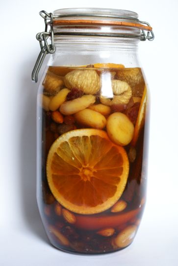 Классический рецепт: ОДИН апельсин порезать толстыми поперечными дольками. В банку сложить все сухофрукты, апельсин, присыпать сахаром и залить водкой. Убрать в темное место, ежедневно встряхивать. Через 3 недели заменить апельсин новым. Настаивать еще 3 недели. Потом профильтровать — ликер готов!