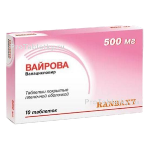 Вайрова - противовирусное средство, препарат который блокирует синтез вирусной ДНК и репликацию вирусов. В организме человека валацикловир превращается в ацикловир и валин. Ацикловир invitro обладает специфической активностью в отношении вирусов простого герпеса I и II типов, вируса Varicella zoster, цитомегаловируса, вируса Эпштейна-Барр и вируса герпеса человека VI типа. Вследствие фосфорилирования ацикловир превращается в активный трифосфат ацикловира, конкурентно ингибируюшего синтез вирусной ДНК. На первой стадии фосфорилирования необходима активность вирусспецифического фермента. Для вируса простого герпеса, вируса Varicella zoster и вируса Эпштейна-Барр это вирусная тимидинкиназа, имеющаяся только в клетках, инфицированных вирусом. При цитомегаловирусной инфекции фосфорилирование ацикловира опосредовано продуктом гена фосфотрансферазы UL97. ФармакокинетикаПосле приема внутрь валацикловир хорошо абсорбируется в желудочно-кишечном тракте (ЖКТ), быстро и практически полностью превращается в ацикловир и валин. Биодоступность ацикловира при приеме 1 г валацикловира составляет 54% и не снижается при одновременном приеме пищи. Максимальная концентрация ацикловира после однократного приема 250 мг - 1 г валацикловира составляет в среднем 15-25 мкмоль/л и достигается через 1,6-2,1 ч после приема; через 3 ч валацикловир в плазме крови не определяется. Связывание валацикловира с белками плазмы крови 13-18%. Период полувыведения ацикловира после однократного и повторного применения составляет примерно 3 ч. Валацикловир выводится почками, главным образом в виде ацикловира и его метаболита 9?карбоксиметоксиметилгуанина. Ацикловир широко распределяется в тканях и жидкостях организма, включая головной мозг, почки, легкие, печень, водянистую влагу, слезную жидкость, кишечник, мышцы, селезенку, матку, слизистую оболочку и секрет влагалища, сперму, амниотическую жидкость, спинномозговую жидкость (СМЖ) (50% от концентрации в плазме), жидкость герпетических пузырьков. Наиболее высокие концентрации создаются в почках, печени и кишечнике. Проникает через плаценту и в грудное молоко. Показания к применениюВайрова используется у взрослых: герпес губ, генитальный герпес (первичная и рецидивирующая инфекция; длительная супрессивная терапия рецидивирующего генитального герпеса у лиц с иммунодефицитом, в т.ч. ВИЧ-инфекцией; снижение риска передачи инфекции половому партнеру), опоясывающий герпес. Способ примененияТаблетки Вайрова принимать внутрь (независимо от приема пищи). Побочные действияПротивопоказанияПротивопоказаниями к применению препарата Вайрова являются: гиперчувствительность, ВИЧ-инфекция при содержании CD4+-лимфоцитов менее 100/мкл, детский возраст (до 12 лет при цитомегаловирусной инфекция (ЦМВ), до 18лет - по остальным показаниям). БеременностьВзаимодействие с другими лекарственными средствамиЛюбые препараты, назначающиеся одновременно с валацикловиром и имеющие этот механизм выведения, могут повышать концентрацию ацикловира в плазме крови. Передозировка:  Условия храненияПрепарат Вайрова хранить при температуре не выше 30°С. Форма выпускаВайрова - таблетки покрытые пленочной оболочкой, 500 мг. Показания к применениюОбсуждение препарата Валацикловир в записях мам
