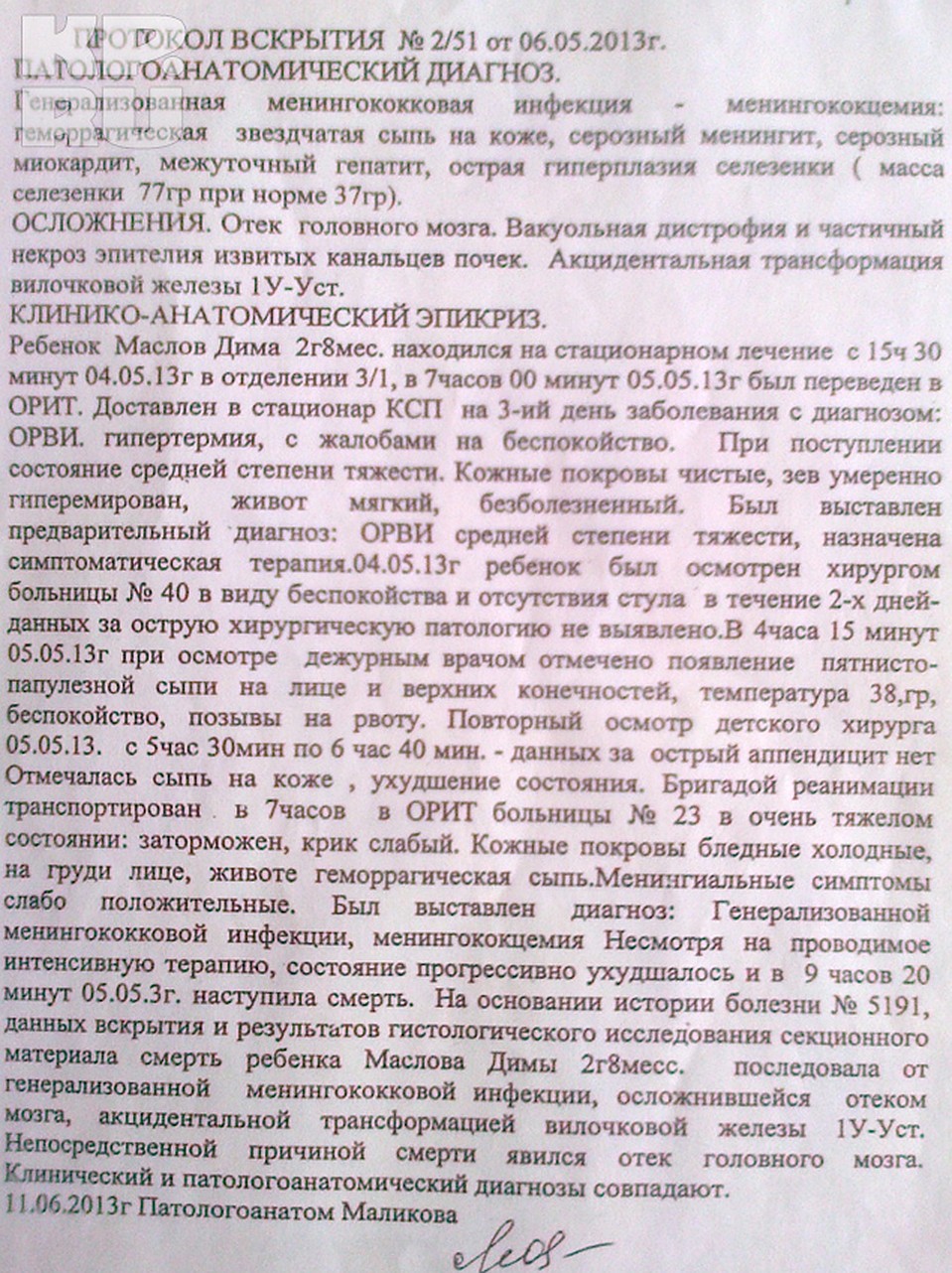 - Дежурный врач сынулю осмотрел, но анализы крови и мочи при поступлении (как это обычно делается) у него не взяли, на яйца глистов только. Дима ревет, а врач ему живот щупает - тот еще сильнее кричит, - вспоминает Наталья. - Врач сказал, что у него подозрение на аппендицит. Диме сделали клизму и отправили к хирургу в больницу № 40. Диагноз не подтвердился, и нас снова привезли в 23-ю. Димке сделали какой-то укол, но врач больше не подходил, не осматривал. Ребенок у меня не ест, не пьет, весь горит, температура не спадает, но хоть ненадолго заснул. Ночью Дима проснулся. Обычно жизнерадостный, улыбчивый мальчик кричал и не находил себе места от боли, температура держалась выше 38 градусов.