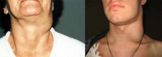 Если выскочила шишка на шее и распространилась на всю ее окружность, то это особая разновидность липомы – диффузная. Болезнь поражает только мужчин зрелого возраста. При диффузной липоме жир откладывается сначала на задней поверхности шеи, а затем процесс распространяется на область подбородка, нижней челюсти и ключиц. Окружность шеи может достигать 65см. Внешне шея выглядит непропорционально огромной по сравнению с головой. При этом сдавливания шейных сосудов и нервов не происходит.