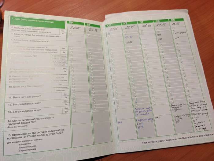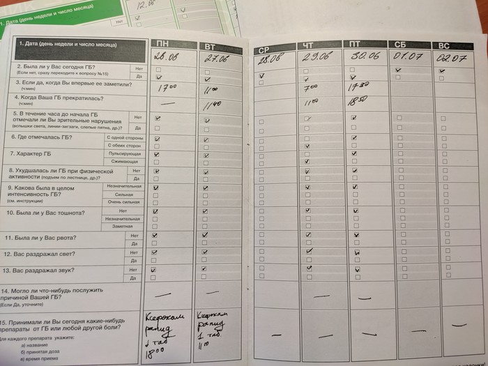 Это такой перечень вопросов о том как часто наблюдаются головные боли, что я делал перед ними, какие средства принимал, какие конкретно симптомы были и все такое. По ее словам, в этой анкете несколько десятков вопросов, но даже не дойдя до конца первого десятка, она остановилась и сказала: "я не вижу смысла продолжать дальше. Для меня картина предельно ясна. У вас острая мигрень". Итак, слово прозвучало. Мигрень.