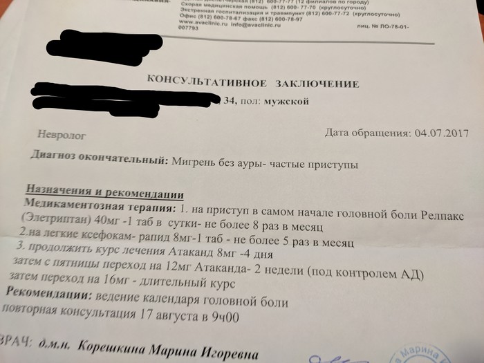 Вторым, в качестве "обычного" обезболивающего мне порекомендовали "ксефокам рапид", который внезапно но помогал от несильных приступов мигрени. А вот если уже он не помогал, то снова "релпакс". Однако, я, как многие неумеющие болеть мужчины, прочитал только названия препаратов. В итоге, когда я за первый месяц съел 20 таблеток "ксефокама", Марина Игоревна мне отругала и ткнула пальцем в заключение, где было написано "не более 5 шт в месяц". Мда, ну. Буду умнее.