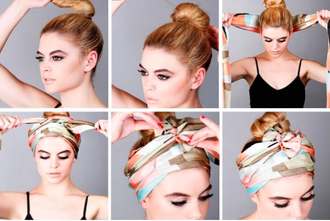 - Шарф перекрестить на лбу или завязать. Обернуть вокруг гульки несколько раз. Должны остаться короткие кончики, которые нужно спрятать под тканью.
