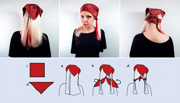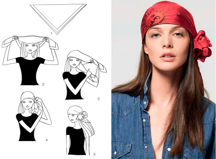 Немного озорной, но в тоже время предельно элегантный и невероятно романтичный – это способ завязывания аксессуара банданой. Для образа морской пиратки подойдёт небольшой треугольный платок, который завязывается узлом на затылке.