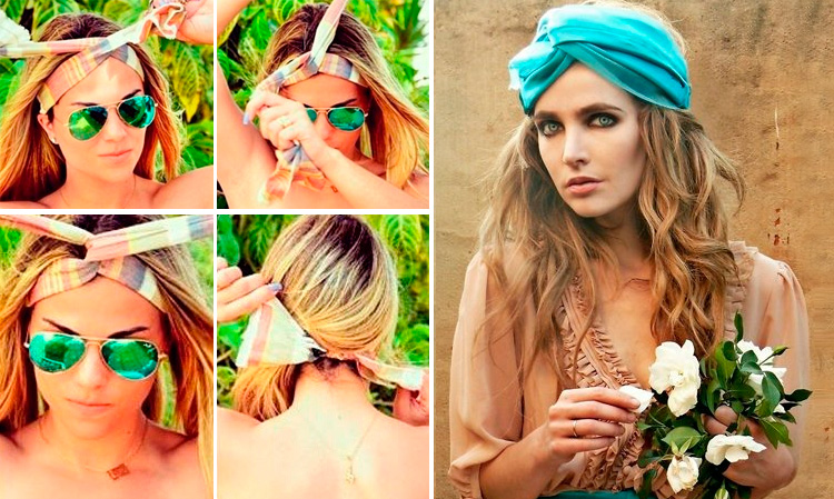 Романтика в образе и неповторимость в стиле обеспечит ношение платка в виде ободка-повязки. Изюминка подобных причёсок в том, что единого секрета нет. Всё просто – методом вариаций подбирается для себя любимой наиболее подходящая композиция: укладка, цвет и фактура платка, вариант закрепления на голове (смещение выше или ниже линии роста волос на лицевой части).