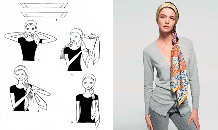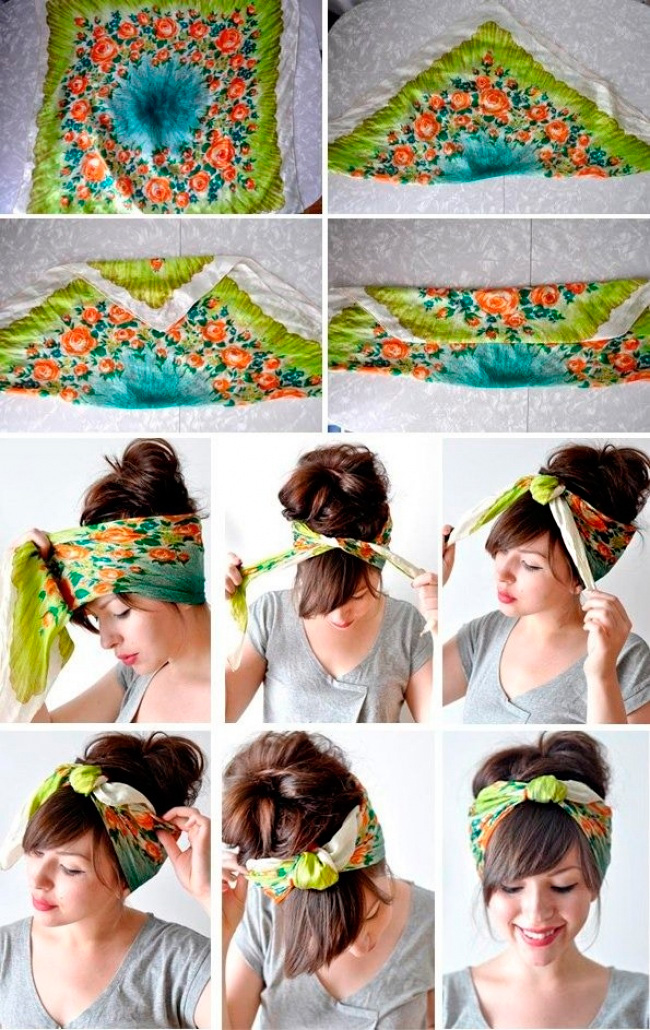 Удобный вариант для подвязывания на длинных волосах. Платок в данном случае напоминает необычный ободок, который не дает волосам падать на лицо. Лучше брать небольшой платок, чтобы ободок вышел не слишком толстым.