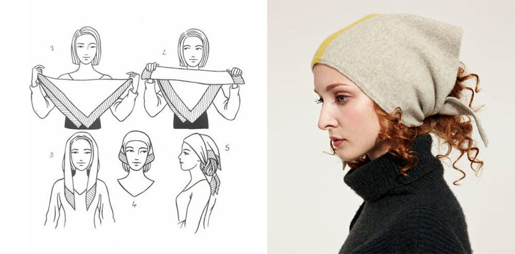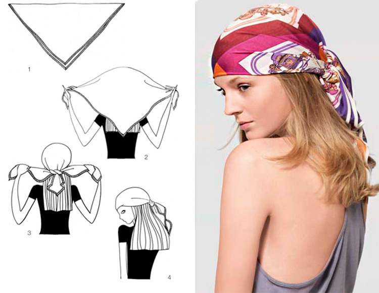 - Для девушек. Сформируйте треугольник и завяжите. Кончики оставьте сверху, а затем спрячьте их в узелок.