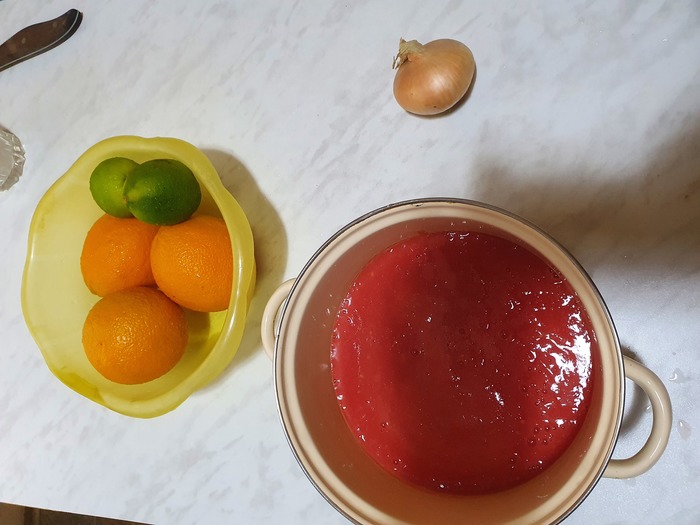 Итак, берём 4 помидора, 3 апельсина, 2 лайма, 1 луковицу, по чайной ложке соли и сахара, и острый чили соус.