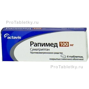 После приема Рапимеда внутрь абсорбция суматриптана происходит быстро, уже через 3/4 ч его содержание в плазме достигает 70% от максимального уровня концентрации. Суматриптану характерен пресистемный метаболизм и неполное всасывание, поэтому его биодоступность составляет 14%. Максимальная концентрация в плазме крови (Сmах) после приема 100 мг суматриптана составляет 0,000 054 мг/мл.