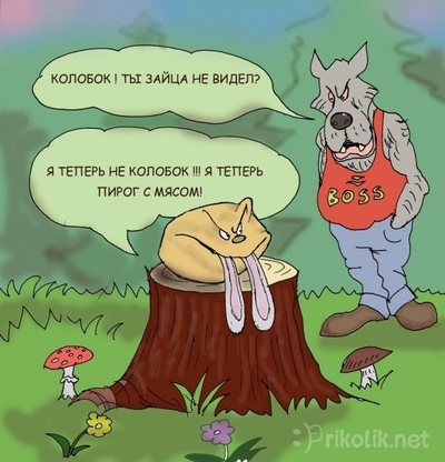 — Я вопьюсь тебе в селезёнку и прожую кишки! — Заорал Колобок и покатился дальше мимо ошалевшего Волка.