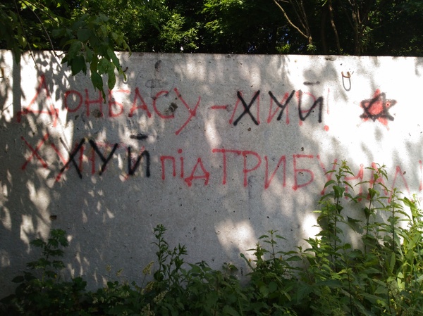 Киев. Некто высказал свою гражданскую позицию на бетонной плите забора, оставив надпись "Донбассу - мир, хунту под трибунал". И чем же ему ответил неизвестный свидомый патриот? Еще раз убеждаюсь, что то самое у них вместо мозгов.