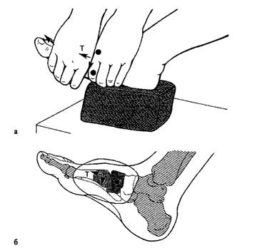 Мобилизация сустава Лисфранка: движение проводится в плантарном направлении (я); схема движения (б).