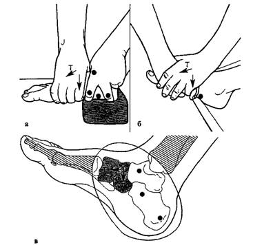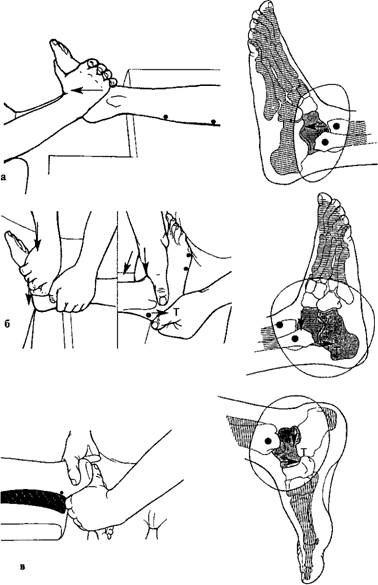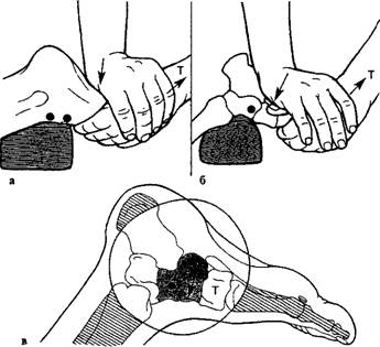 Варианты мобилизации таранной кости: в дистальном направлении с легкой тракцией (а); в дорсальном (б); в вентральном (в) направлениях.
