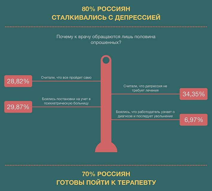 Но при этом большинство опрошенных уверены, что терапевты или врачи общей практики должны обладать необходимыми знаниями и навыками, чтобы вовремя распознать депрессию (91%). А 70% и сами готовы пойти к такому квалифицированному терапевту, чтобы выявить и пролечить депрессию.