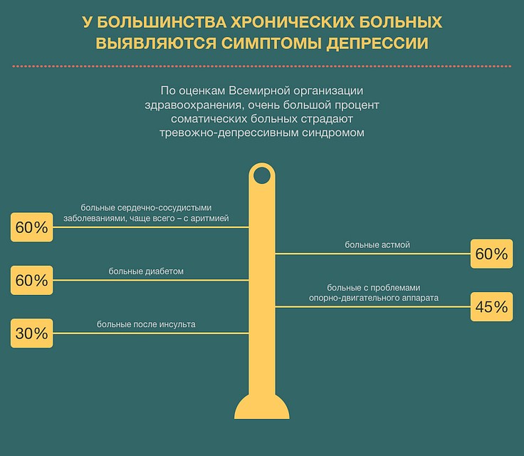 Между тем тревожно-депрессивное расстройство может маскироваться многочисленными симптомами – начиная от синдрома раздраженного кишечника, заканчивая ощущениями перебоев в области сердца. В свою очередь тревожно-депрессивные состояния сопровождают большинство соматических заболеваний, о чем многие узкие специалисты также просто не догадываются (см. Кстати). Есть еще одна проблема – стигматизация психиатрии. По-прежнему в нашей стране психиатры воспринимаются как каратели, а направление к психиатру – как нечто опасное и унизительное. Мол, да не может со мной такого случиться, все у меня с мозгами в порядке! И если пациента направляют к психиатру, это воспринимается в штыки.