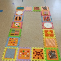 Ребенок, стоя босиком, пальцами ног составляет узор по образцу и схеме.