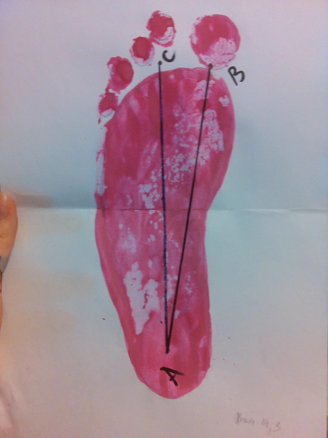 5. Определяем степень плоскостопия. Для этого на отпечаток наносят две линии: АВ, соединяющую середину пятки с серединой основания большого пальца, и АС, соединяющую середину пятки со вторым межпальцевым промежутком. Если внутренний изгиб контура отпечатка стопы заходит за линию АС или располагается на ее уровне – стопа нормальная; если находится между линиями АВ и АС - стопа уплощена (плоскостопие 1-й степени); если не доходит до линии АВ - плоскостопие 2-й и 3-й степени.