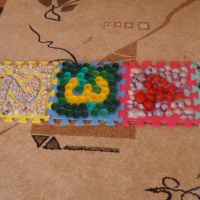 - Далее на ткань крепятся подручные материалы: камешки, крышки от пластиковых бутылок, пуговицы и так далее. Малышу будет интереснее, если маленькие детали станут разного цвета. Поэтому при выборе крышек необходимо уделить внимание и собрать разноцветные детали.