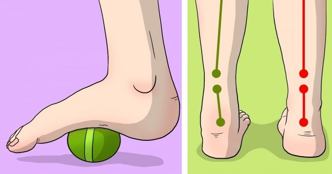 - Медленно и с нажимом катайте мяч стопой к пальцам ног и обратно.