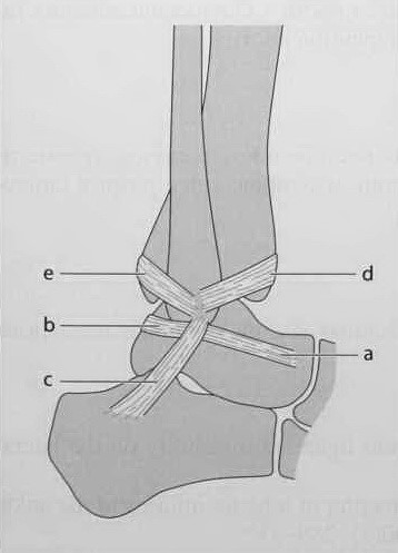 а-е Анатомия латеральной связки голеностопного сустава, (а) Передняя таранно-малоберцовая связка. (b) Задняя таранно-малоберцовая связка, (с) Пяточно-малоберцовая связка. Синдесмоз. (d) Передняя большеберцово-малоберцовая связка.