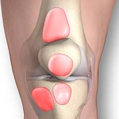 Синовиальные сумки (небольшие мешочки из соединительной ткани, заполненные синовиальной жидкостью). Вокруг коленного сустава их находится около 10 штук. Некоторые из них сообщаются с суставной полостью.